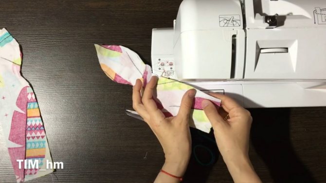 Далее, берём 1 деталь с “ушками” и вставляем деталь с резинкой в отверстие, которое мы оставляли. Совмещаем края и прошиваем на машине. Тоже самое делаем со 2 — ой деталью с “ушками”.