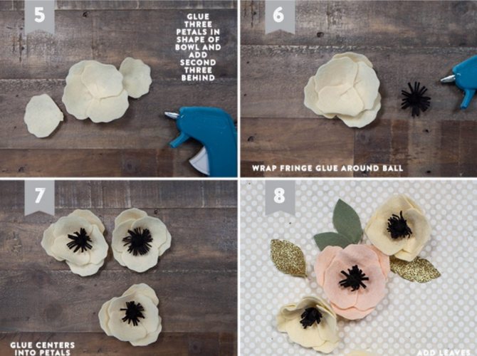 - Кружочки из ткани складывать кульком и приклеивать на фетровую основу, а затем размещать друг на друге. В процессе их можно распушить, чтобы цветок получился пышным и красивым.
