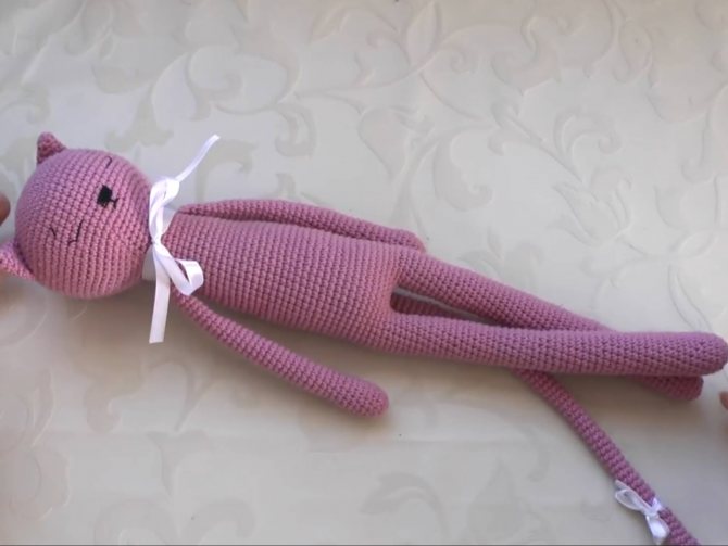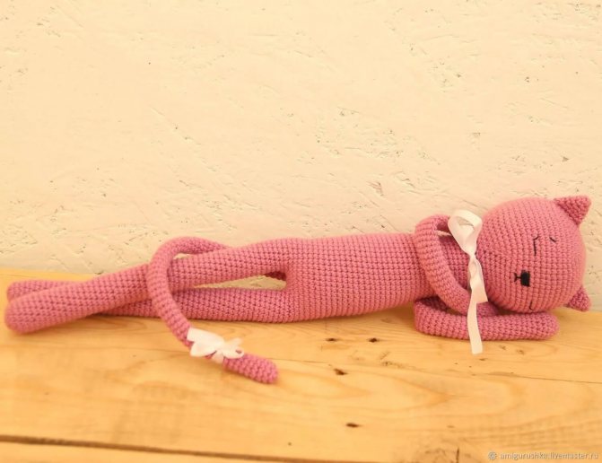 С таким котом детям можно и спать, и играть. Этого котика можно связать из хлопчатобумажной пряжи Ализе белла 50 гр./180 м. Номер крючка — 2,5 мм. На изделие уходит 1 моток ниток. Ещё понадобится черная нитка Мулине и ленточка для украшения. Все детали игрушки вяжутся по спирали и по мере изготовления набиваются синтепухом или другим наполнителем.
