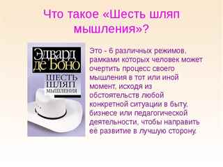 Шесть шляп мышления – простой и практический способ, позволяющий преодолеть три фундаментальные трудности, связанные с практическим мышлением: эмоции, беспомощность, путаница. Метод позволяет разделить мышление на шесть типов, или режимов, каждому из которых отвечает метафорическая цветная “шляпа”.