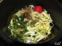 - Кожицу с помидора снимите, бросьте к остальным продуктам, а также зелень, лавровый лист, соль, специи. Залейте все двумя литрами кипяченой воды. Выставьте режим приготовления “суп” на 30 минут. Крышка должна быть обязательно.