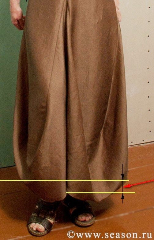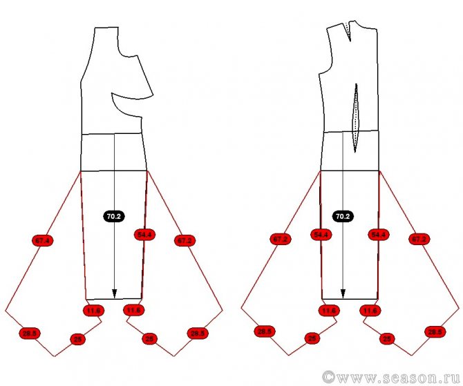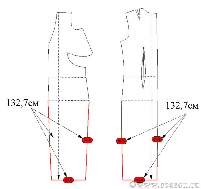 - третий: от уровня бёдер вниз 20 см по боковому шву, по средней линии – вверх 10 см.