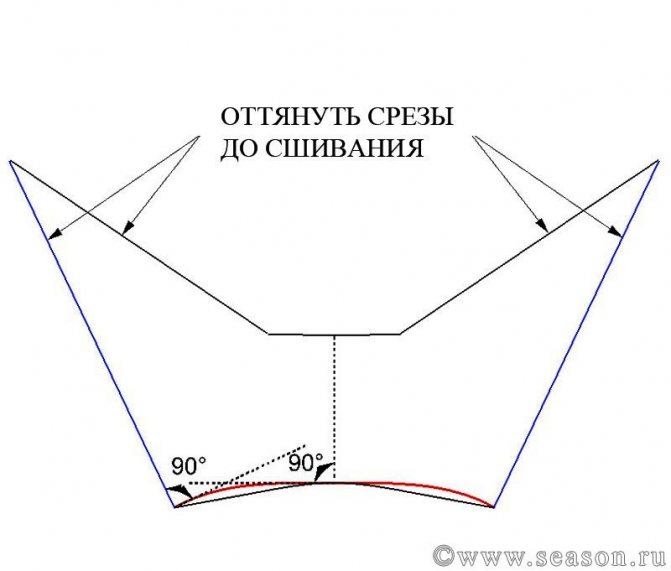 Затем нужно откорректировать нижние углы – сделаем их прямыми, поправим нижнюю линию. Срезы, обозначенные синим цветом, перед притачиванием нужно приутюжить с отпариванием, растягивая.