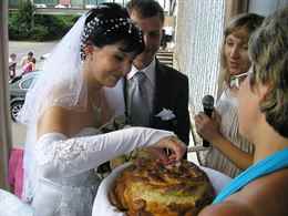 Затем молодожены переступают рушник и идут к матери, держащей пирог. Они выслушивают красивые поздравительные слова и отламывают кусочки пирога. Дальше кормят им друг друга или же преподносят приглашенным. По завершению данного действия молодые супруги входят в помещение для банкета, за ними следуют родители и оставшиеся гости.