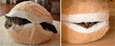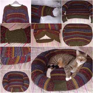 Если в шкафу завалялся старый свитер, то его очень легко можно превратить в спальное место для своего питомца. Для этого нужно вывернуть свитер наизнанку, отрезать горловину и зашить отверстие. Затем свитер выворачивают на лицо и прострачивают дугой отрезок от подмышки к подмышке. Далее пришивают рукава к основной части. Осталось набить рукава и основную часть синтепоном, зашить низ свитера потайным стежком и сшить рукава вместе. Удобное и мягкое местечко для кошки готово.
