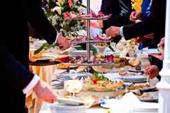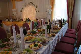 Все чаще молодожены предпочитают заменять большое количество столов с различными видами еды одним большим, где каждый может выбрать понравившееся угощение и съесть его за своим столиком. В большинстве случаев такое устройство банкетного зала оказывается более удобным, находится больше места для проведения развлекательной программы. Шведский стол позволяет гостям самостоятельно взять порции любимых блюд, не тревожа других присутствующих.