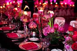 | Декор столов | Рассыпные свечи в фуксиевых подсвечниках, вазы с цветами фуксии, салфетки в тон | Серебристый, белый, зеленый |