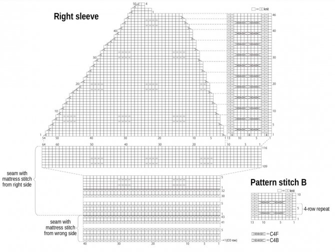 1-й р: 1 лиц., прибавка (тянем п. из нижнего р.), 4 лиц., приб., 4 лиц., приб., 2 вместе с наклоном вправо, 49 лиц., 2 вм. с накл. влево. Дальше см. убавки по схеме. Убавляем только основной узор, “косу” не трогаем. Правый рукав делаем в зеркальном отражении.