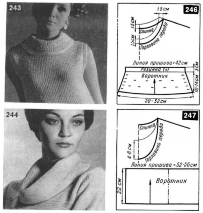 Давайте разберемся, как красиво вязать воротник хомут. Ведь это, пожалуй, самый популярный воротник спицами для женщин. Рассмотрим 2 варианта — небольшой (неглубокий) воротник-хомут, который полностью закрывает шею (рис. 243) и большой воротник хомут, который ложится складками на верхнюю часть полочки (рис. 244).