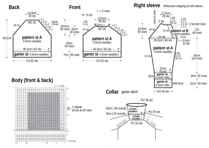 Перевод терминов с английского языка: Pattern — раппорт узора (узор), cm — сантиметры, knit — лицевая, sts — петля, rows — ряд, garter st — вязание по кругу, rounds — круговой, times — раз, разы, repeat — повтор.р Sleeve — рукав, Collar — воротник, Back — спинка, Front — передняя часть.