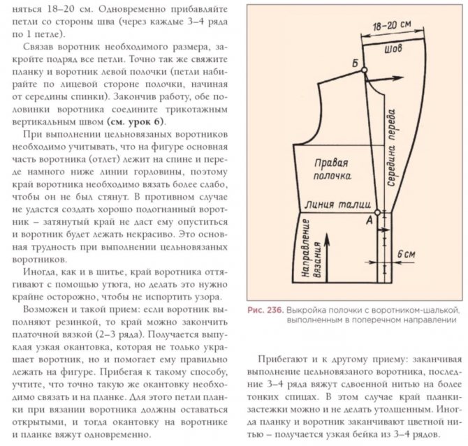 Перед нами женская кофточка с шалевым воротником спицами (рис. 235). Здесь воротник связан с поперечном направлении. И второй вариант — кофта с шалевым воротником, где воротник шалька может быть выполнен непосредственно вместе с полочкой.