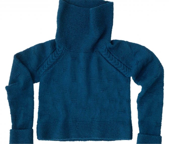 После того, как мы сшили боковые стороны, швы рукавов, пришили рукава к передней части и спинке, можно приступать к воротнику. Поднимаем от горловины на спицы 4,25 мм. примерно 140 п. (по полочке 32 п, по спинке — 25 п., остальные п. распределяем равномерно). Вяжем 8 см. (32 р.) платочной вязкой. Затем переходим на спицы 4,5 мм. и делаем 10 см. (39 р) той же вязкой. Закрываем п.