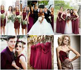 Подружки невесты будут эффектно выглядеть в однотонных броских убранствах в оттенках марсала. Длина и фасон платья могут быть разнообразными, главный акцент должен быть выражен на цвете.