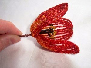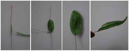 Бывает, что при сборке цветочка витки распадаются, тогда их нужно закрепить методом прошивания тонкой проволокой. Укреплять нужно вкруговую, листок – в середине, поперек рядов деталей бисера.