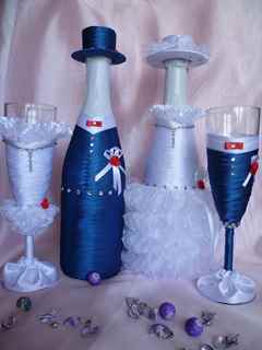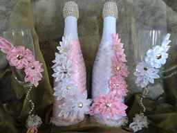 Украшение бутылок жениха и невесты, а также бокалов лентами или бейкой дает раскрыться фантазии мастера и сделать абсолютно уникальные, неповторимые изделия, которые будут радовать глаз молодоженов и гостей.