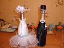 Оформление свадебных бутылок в виде жениха и невесты лентами осуществляется следующим образом: