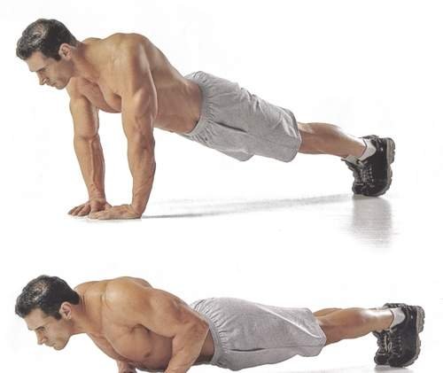 - Отжимания. Со средней или узкой постановкой рук, на кулаках или на одной из рук — не важно, какие именно, ведь грудные мышцы отлично прорабатываются вне зависимости от вида исполнения упражнения.