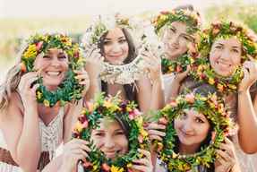 И напоследок, рассмотрим девичник в традиционном русском стиле. Он предполагает проведение древнерусских обрядов, гадания, пускание на воду венков. Одежда должна быть очень простой. Например, юбка и рубашка, сарафан. Головы девушек украшают ленты или используют в качестве украшения венки из полевых цветов. Макияж естественный и нежный.