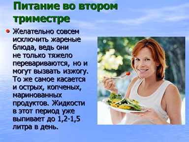 Правильное питание становится особенно актуальным во втором триместре. Женщинам рекомендуется увеличить потребление белка, кальция и железа, а также витаминов и минералов. Важно включать в рацион разнообразные продукты: фрукты, овощи, цельнозерновые продукты, нежирное мясо и молочные изделия. Также стоит помнить о достаточном потреблении жидкости.