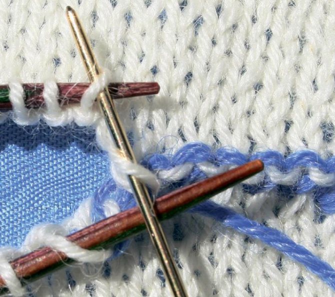 Набираем вспомогательной пряжей 30 п. (см. вспомогательный набор выше) и вяжем 2 р. лиц. гл.