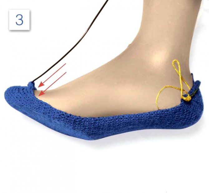 - В следующем лицевом ряду наберите 2 п. на стыке мыска со средней частью стопы, провяжите еще 30 п. дальше, равномерно убавляя по 3.