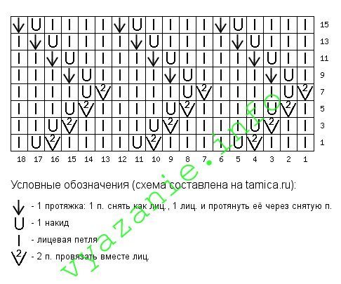 Раппорт лицевого ряда узора прост: две петли вместе – протяжкой (то есть одну петлю снять лицевой, одну петлю провязать лицевой и протянуть снятую), затем выполнить один накид. Узор нужно повторить нужное количество раз. Последняя петля – лицевая. Не стоит забывать о кромочных петлях!
