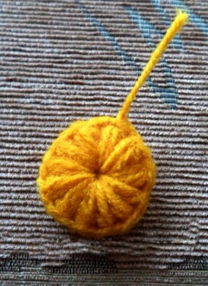Через 1 ВП вяжем еще 11 пышных ст. Завершаем круг. р. СС на вершине пышного ст. Нитку обрезаем, конец выводим на изнанку и закрепляем.