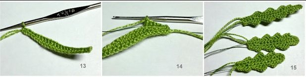 Средний лист состоит из двадцати рядов. С первого по семнадцатый ряд вяжете, как большой листок. В восемнадцатом ряду левый край довязываете по схеме большого листа, а среднее ответвление начинаете со снопа из четырех столбиков, заканчиваете десятью ССН. Далее набираете такой же сноп, рогатку, два ССН, рогатку. Заканчиваете средний лист снопом из четырех столбиков. Маленький лист состоит из шестнадцати рядов (читайте схемы ромашек крючком на четвертом фото). Работа начинается с трех петель.