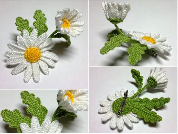 Далее все детали крахмалите, клеите к стеблю, получаете букет ромашек. Эти цветы украсят любое изделие. Можно сделать горшечное растение, а можно связать шаль крючком. Ромашки обвязываете сеткой и украшаете бахромой.