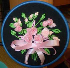 В данном случае вышивается картина с изображением розы. Сам цветок вышивается атласными лентами, а ветки и листочки можно нарисовать акварельными карандашами. Ткань для вышивки тонируется специальной акриловой краской.