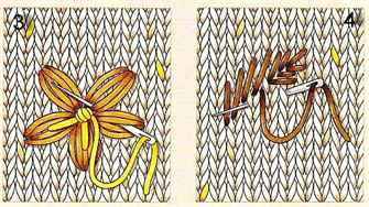 Для розы складываем нитку два раза и закрепляем. Теперь выходим иголкой на внешнюю часть и направляем иглу сквозь вязаное изделие концом вверх. Наматываем нить на иглу, количество завитком произвольное, но от их количества зависит размер лепесточка.