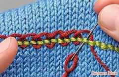 Сначала для выравнивания петель смачиваем и просушиваем вязаные детали. Затем выводим иглу с изнаночной зоны на лицо, оставив на изнанке хвостик, когда в работе будет протяжка, хвостик заправляется в работу. Выходим иглой у основы петли и направляем ее наверх по ходу петли. Далее идем вниз и опять иглу заводим в основание. Идем ниже и входим иглой в основание, потом выходим ниткой в основание очередной петли по горизонтали. Теперь направляем иглу вертикально вверх по направлению петли, идем ниже в ее основание и затем в основание очередной петли по горизонтали.