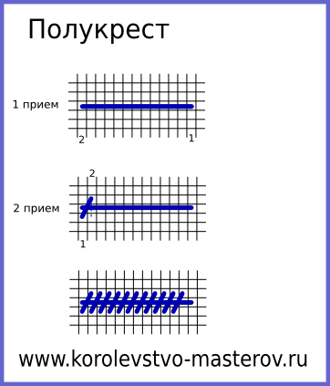 Полукрест — это не два, а один диагональный стежок, обычно имеющий наклон вправо. Изнанка полукреста не отличается от изнанки счетного крестика — это вертикальные (иногда горизонтальные) стежки.