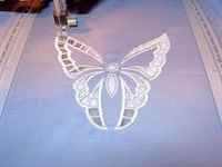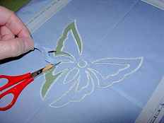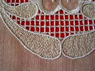 На этом этапе приступаем к вышивке, она прошивается нитями выбранного цвета. После обстрочки всего орнамента, наступает очень кропотливый момент в работе. Необходимо очень аккуратно вырезать все части, где должен располагаться ажурный орнамент. При вырезании необходимо отрезать только ярусы, но при этом нельзя повреждать водорастворимый флизелин. Поэтому ножницы должны быть не только очень острые, но и еще изогнутые. Делать обрезку ткани необходимо как можно ближе к месту, где была строчка.
