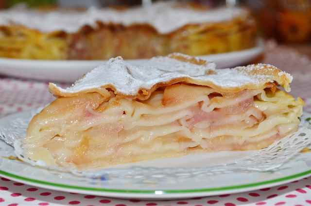 Такой рецепт слоеного пирога был предложен от Юлии Высоцкой – мамы, жены, хозяйки и успешной телеведущей. В ее архивах есть множество вариантов яблочных пирогов и других блюд. Удобно, что все рецепты с фото сопровождением и объясняются пошагово, поэтому каждая женщина может приготовить изысканное лакомство.