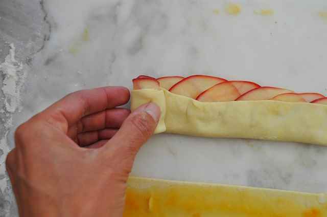 Подготовленное ранее тесто (можно купить в магазине), тонко раскатывается и нарезается полосками, должно получиться около 6 полосок из пласта теста 27*42 см. На каждую полоску укладываются яблоки, при этом ломтик яблока должен немного заходить на предыдущий. Получится около 8 ломтиков на каждой полоске теста.