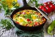 Согласно рецепту, потребуется: четыре куриных яйца; одна головка репчатого лука; два помидора; бекон, сыр, зелень, специи – по вкусу.