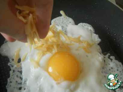 - Натрите сыр на крупной терке или нарежьте его кубиками и посыпьте сверху яиц.