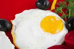 - Когда яичница будет почти готова, кладем на дно сковородки сливочное масло, при этом приподняв край яичницы.