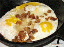 - После того, как дно яичницы посветлело, высыпаем сверху шкварки и жареный лук.