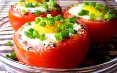 - Взбиваем яйца до пены и вливаем яичную массу в каждую помидорку.