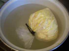 - Вставляем пакет в пакет, чтобы получился двойной, и выливаем туда яичную массу. При завязывании необходимо оставить в пакетах немного пустого пространства.