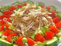 Для начала нужно приготовить все овощи, помыть их. Потребуются помидоры черри – 5 шт, огурец – 1 шт, половинка зеленого острого перца. Нарезать помидоры нужно половинками, огурец соломкой, а перец – кружочками. Также нужен 1 пучок листьев салата, их нужно помыть, высушить и порезать, после чего поместить в емкость. Куриное филе необходимо заранее отварить и порезать на маленькие кусочки. Лучше брать части курицы, где мясо не сухое (голень, бедра).