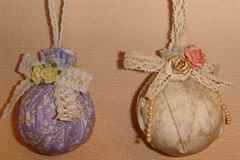 Также можно сделать ёлочные игрушки из ткани. За основу берётся обычный шар, либо самодельный (из бумаги, поролона, пенопласта и прочего), обтягивается тканью и украшается по вашему желанию.